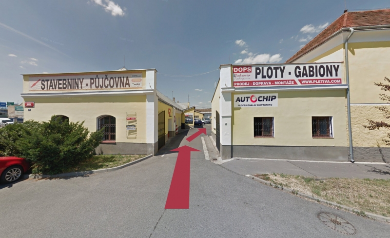 Zadní část průmyslového areálu, vchod pro zákazníky společný s půjčovnou dodávek.